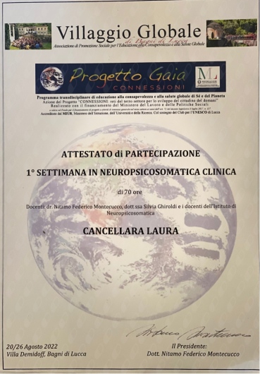 Sono laureata anche in Scienze delle attività motorie con specializzazione in Rieducazione motoria, specializzata in disabilità e abilitata all'insegnamento. Sono Conduttrice dei Gruppi Balint Analitici, Coordinatrice SIMP Società di Medicina Psicosomatica Sede Roma Pietralata, Tecnico FGI-Coni e specialista di tecniche psicocorporee. Inoltre i specializzanda al 4 anno della Scuola Sistemico Relazionale Iefcos in psicoterapia della famiglia.